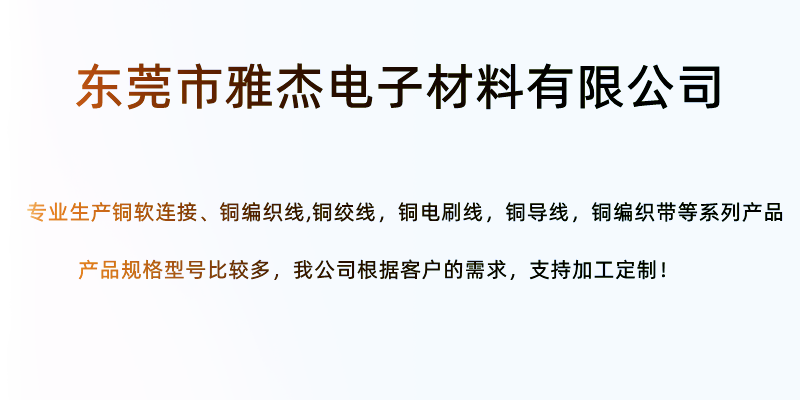 Dongguan Yajie Company is specialized in the production of (copper flexible connections)(copper braided wires)(copper stranded wires)(copper brush wires)(expansion joints)(copper wires;)(Copper braided tape)(Copper conductive tape)(Copper bar)(Tinned copper braided tape)(Aluminum conductive tape)(Epoxy coated copper bar)(Plastic-sprayed conductive copper bar)(Battery soft copper bar)(Stainless steel braided tape)(Ground soft connection)(Flange electrostatic jumper wire)(Copper foil soft connection)(Copper sheet soft connection)(Copper woven mesh)(Copper shielding mesh)(Braided copper tape)(Braided copper wire)(Braided soft connection)(Conductive woven woven tape)(Conductive soft connection)(Lightning protection copper wire)(Copper bus soft connection)(Copper bus soft connection)(Copper wire braided tape)(Copper ground wire)(Copper grounding braided wire)(copper grounding soft connection)(copper bar soft connection)(copper stranded wire soft connection)(stainless steel braided wire)(aluminum braided tape)(aluminum conductive tape)(aluminum soft connection)(copper-clad aluminum braided tape)(copper-clad aluminum braided tape)(copper-clad steel braided tape)(copper-clad steel braided wire)(ground wire)(gas-liquid filter)(flange electrostatic jumper wire)(vapor-liquid filter) Crochet wire mesh)(metal wire mesh)(Shielding wire mesh)(glass fiber sleeve)(Silicon sleeve)(glass fiber sleeve)(self-extinguishing tube)(inner fiber outer rubber sleeve)(insulating sleeve)(heat shrink tube)(PVC sleeve)(electrical sleeve) and other products. The copper weaving series is used in high and low voltage electrical appliances, vacuum appliances, high and low voltage switchgear, new energy vehicle batteries, bus ducts, transformers, electroplating tanks, welding machines, automobiles, electric locomotives, electric furnaces, mining explosion-proof electrical appliances, generator sets, soft connection of carbon brushes and wires, etc. The insulating sleeve series is mainly used in electronics factories, lighting factories, motor factories, electric machinery factories, and electrical equipment factories to provide insulation, high voltage resistance, protection, high temperature resistance and flame retardant effects. The company adheres to the business philosophy of "customer first, forge ahead" and adheres to the principle of providing high-quality services to our customers. Welcome to visit!- Name(chinese)