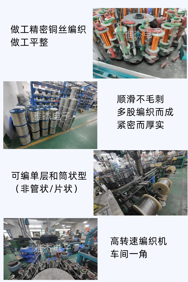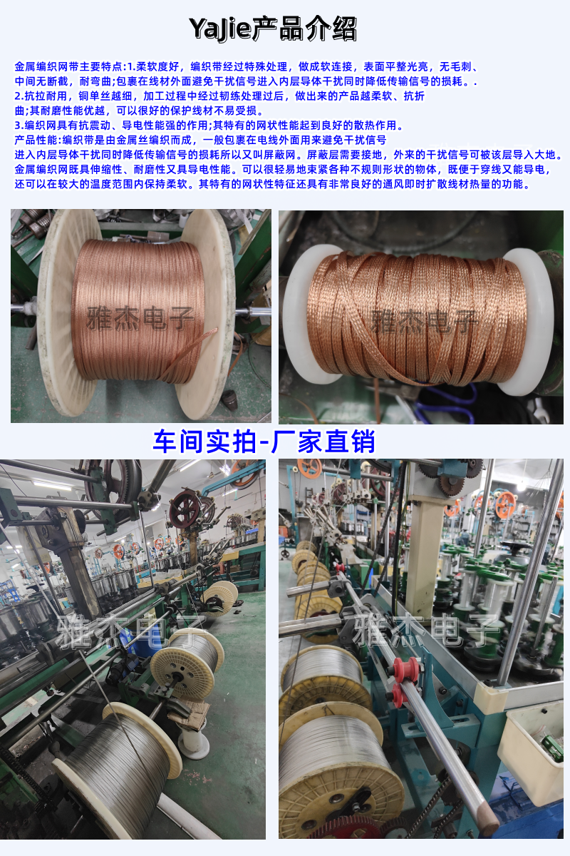 Dongguan Yajie Company is specialized in the production of (copper flexible connections)(copper braided wires)(copper stranded wires)(copper brush wires)(expansion joints)(copper wires;)(Copper braided tape)(Copper conductive tape)(Copper bar)(Tinned copper braided tape)(Aluminum conductive tape)(Epoxy coated copper bar)(Plastic-sprayed conductive copper bar)(Battery soft copper bar)(Stainless steel braided tape)(Ground soft connection)(Flange electrostatic jumper wire)(Copper foil soft connection)(Copper sheet soft connection)(Copper woven mesh)(Copper shielding mesh)(Braided copper tape)(Braided copper wire)(Braided soft connection)(Conductive woven woven tape)(Conductive soft connection)(Lightning protection copper wire)(Copper bus soft connection)(Copper bus soft connection)(Copper wire braided tape)(Copper ground wire)(Copper grounding braided wire)(copper grounding soft connection)(copper bar soft connection)(copper stranded wire soft connection)(stainless steel braided wire)(aluminum braided tape)(aluminum conductive tape)(aluminum soft connection)(copper-clad aluminum braided tape)(copper-clad aluminum braided tape)(copper-clad steel braided tape)(copper-clad steel braided wire)(ground wire)(gas-liquid filter)(flange electrostatic jumper wire)(vapor-liquid filter) Crochet wire mesh)(metal wire mesh)(Shielding wire mesh)(glass fiber sleeve)(Silicon sleeve)(glass fiber sleeve)(self-extinguishing tube)(inner fiber outer rubber sleeve)(insulating sleeve)(heat shrink tube)(PVC sleeve)(electrical sleeve) and other products. The copper weaving series is used in high and low voltage electrical appliances, vacuum appliances, high and low voltage switchgear, new energy vehicle batteries, bus ducts, transformers, electroplating tanks, welding machines, automobiles, electric locomotives, electric furnaces, mining explosion-proof electrical appliances, generator sets, soft connection of carbon brushes and wires, etc. The insulating sleeve series is mainly used in electronics factories, lighting factories, motor factories, electric machinery factories, and electrical equipment factories to provide insulation, high voltage resistance, protection, high temperature resistance and flame retardant effects. The company adheres to the business philosophy of "customer first, forge ahead" and adheres to the principle of providing high-quality services to our customers. Welcome to visit! -